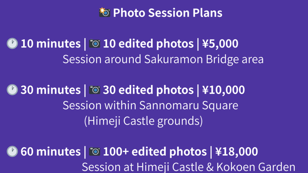 (ここだけじゃ物足りない?関西の他の都市でも、あなたの素敵な瞬間を撮影します!詳細はこちらをご覧ください!)