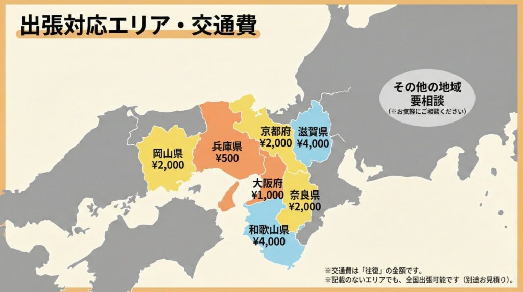 エリアに応じて、別途交通費をいただいております。関西圏を中心に、全国どこでも撮影対応しています。